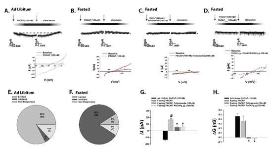 Whereas obesity exemplifies a state of positive energy balance, fasting represents a state of negative energy balance. Food-restricted mice show low levels of POMC and PACAP mRNA expression coupled with an increase in NPY mRNA expression, and i.c.v. injections of PACAP decrease energy intake after 30 min of refeeding [247,250]. Surprisingly, in recent experiments we found that during voltage clamp recordings in POMC neurons from eGFP-POMC mice subjected to an 18-h fast for five consecutive days, the PACAP response reversed polarity from a predominantly excitatory inward current seen under ad libitum conditions to an inhibitory outward one (Figure 2A,B,E–H); see Supplementary Materials for full material and methods The inset I/V plots corresponding to the representative current traces in Figure 2A,B revealed that the reversal potential shifted from ~−20 mV under ad libitum conditions (indicative of a mixed cation current) to ~−90 mV under fasted conditions (indicative of a K+ current). The PACAP-induced inhibitory outward current and the corresponding increase in conductance seen under fasting conditions were virtually abolished by the KATP channel blocker tolbutamide and the PAC1 receptor antagonist PACAP6–38 (Figure 2C,D,G,H; 2G: one-way ANOVA/LSD, F = 25.71, df = 3, p < 0.0001; 2H: one-way ANOVA/LSD, F = 9.78, df = 3, p < 0.0001).
