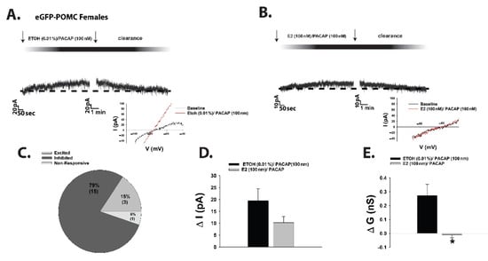 E2 attenuates the PACAP-induced outward current in POMC neurons observed under fasting conditions. (A,B) are representative membrane current traces during voltage clamp recordings in EtOH vehicle- (0.01% (v:v); n = 11) and E2-treated (100 nM; n = 8) slices from OVX females that illustrate the estrogenic diminution of the robust and reversible PACAP-induced outward current and change in K+ conductance (as seen from the inset I/V plots). (C), Pie chart that indicates the percentage of POMC neurons from OVX females that are excited by, inhibited by, or unresponsive to PACAP under fasting conditions. (D,E) show the composite data underscoring the ability of E2 to negatively modulate the PACAP response. Bars represent means and lines 1 SEM of the PACAP-induced ΔI and ΔG in POMC neurons from OVX females under fasting conditions. *, p < 0.05 relative to EtOH vehicle, Student’s t-test.