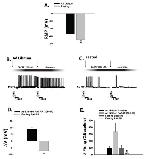 The PACAP-induced outward current observed during fasting conditions is associated with a hyperpolarization and a decrease in firing. (A), Composite bar graph that demonstrates the more hyperpolarized RMP of POMC neurons under fasting conditions. (B,C), Representative current clamp traces from POMC neurons showing the reversible PACAP-induced depolarization and increase in firing under ad libitum-fed conditions (n = 10) and the reversible hyperpolarization and suppression of firing seen under fasting conditions (n = 10). Comparable effects are seen during recordings in vehicle pre-treated slices from OVX females. (D,E), Composite data illustrating the PACAP-induced changes in membrane potential (ΔV) and firing rate under ad libitum-fed and fasting conditions. Bars represent means and lines 1 SEM. * p < 0.05, relative to ad libitum-fed conditions, Student’s t-test (D); relative to baseline, Kruskal–Wallis/median-notched box-and-whisker analysis (E). Figure adapted from [12].