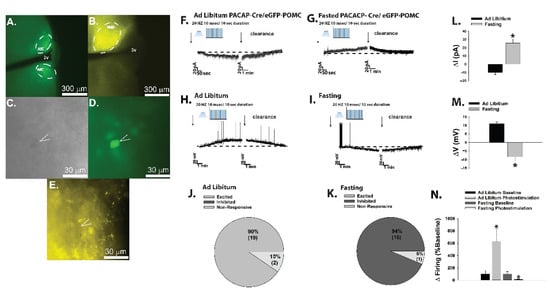 Optogenetic stimulation of VMN PACAP neurons depolarizes POMC neurons and increases their firing under ad libitum-fed conditions, effects which are flipped under fasting conditions. (A), Low power (4×) image of ARC POMC neurons taken from a PACAP-Cre/eGFP POMC mouse. (B), Photomicrograph (4×) showing the channel rhodopsin-2 expression in VMN PACAP neurons two weeks after AAV injection as visualized by eYFP. (C), Differential interference contrast image (40×) of a recorded POMC neuron and the corresponding eGFP fluorescence signal from the same neuron (D). (E), 40X image showing the eYFP-labeled fibers in the immediate vicinity of the recorded neuron. Photostimulation (10-ms pulses delivered at 20 Hz for 10 s) of male VMN PACAP neurons produces a reversible inward current linked to membrane depolarization and increase in the firing of ARC POMC under ad libitum-fed conditions neurons (F,H,J,L–N); n = 7–11), and the exact opposite is seen under fasting conditions (G,I,K–N); n = 11–13). Bars represent means, and lines 1 SEM of the light-induced change in ΔI (L), ΔV (M) and firing rate (N). * p < 0.05, relative to ad libitum-fed conditions, Student’s t-test (L,M); relative to baseline, Kruskal–Wallis/median-notched box-and-whisker analysis (N). Figure adapted from [12].