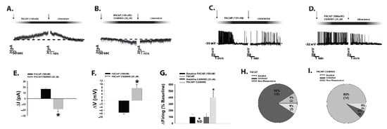 The fasting-induced switch in the polarity of the PACAP response in POMC neurons involves the activation of protein tyrosine phosphatases. Representative traces show that the PACAP-induced outward current (A; n = 12) and hyperpolarization (C; n = 10) seen under fasting conditions reverts back to an inward current (B; n = 9) and depolarization (D; n = 7) in the presence of the PTP1B/TCPTP inhibitor CX08005 (20 μM; B). This is further substantiated by the composite bar graphs in (E–G) as well as the pie charts in (H,I). Bars represent means, and lines 1 SEM of the PACAP-induced change ΔI, ΔV or normalized firing rate under fasted conditions, alone and in combination with CX08005, Compound C or metformin. * p < 0.05, relative to PACAP alone, Student’s t-test (E,F); relative to baseline, Kruskal–Wallis/median-notched box-and-whisker analysis (G).