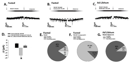 An equally dramatic switch in the polarity of the PACAP response in POMC neurons was observed during voltage clamp recordings in slices from both fasted eGFP-POMC mice that were pre-treated with AMPK inhibitor Compound C (Figure 7A,B,D–F), and from ad libitum-fed animals that were pre-treated with the AMPK activator metformin (Figure 7C,D,G; 7D: one-way ANOVA/LSD, F = 41.35, df = 2, p < 0.0001).