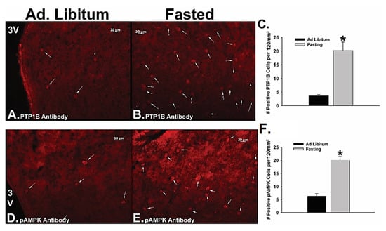 Fasting augments the activity and expression of PTP1B and AMPK in the ARC. The four 20× images depict the PTP1B (A,B; 1:100) and pAMPK (D,E; 1:100) immunoreactivity under ad libitum-fed (A,D) and fasting (B,E) as visualized with AF546 (1:600). The composite data in the bar graphs summarize the fasting-induced increase in the number of PTP1B- (C) and pAMPK-immunoreactive (F) cells per capita in the ARC. Bars represent means and lines 1 SEM. * p < 0.05, relative to ad libitum-fed conditions, Student’s t-test.