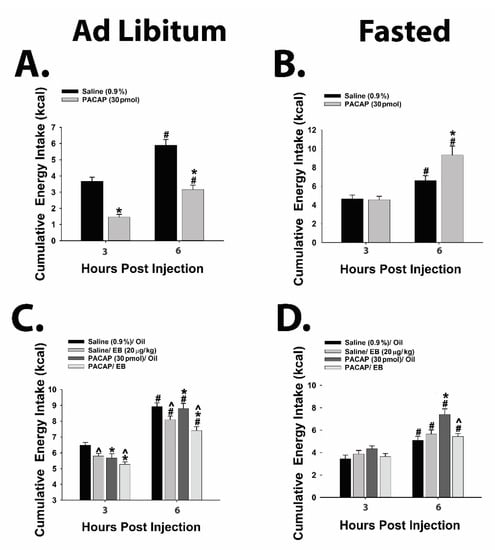 Moreover, the flipped PACAP-induced change in the excitability of POMC neurons yielded parallel alterations in energy intake. Indeed, the pronounced anorexigenic response generated by PACAP administered directly into the ARC of ad libitum-fed wildtype male mice (Figure 9A; repeated measures multifactorial ANOVA/LSD, Ftime = 45.21, df = 1, p < 0.0001; FPACACP = 71.82, df = 1, p < 0.0001; Finteraction = 0.72, df = 1, p < 0.40) was completely reversed in fasted animals, such that there was no change in cumulative energy intake at three hours post-injection and a significant increase six hours after administration (Figure 9B; repeated measures multifactorial ANOVA/LSD, Ftime = 28.18, df = 1, p < 0.0001; FPACAP = 4.32, df = 1, p < 0.04; Finteraction = 4.79, df = 1, p < 0.04; one-way ANOVA/LSD, F = 12.88, df = 3, p < 0.0001). A similar profile was observed in OVX wildtype female mice; with PACAP decreasing cumulative energy intake in ad libitum-fed, sesame oil vehicle-treated OVX females, which was significantly potentiated in estradiol benzoate (EB)-treated OVX females (Figure 9C; repeated measures multi-factorial ANOVA/LSD: Ftime = 417.17, df = 1, p < 0.0001), FPACAP = 9.00, df = 1, p < 0.004, FEB = 20.59, df = 1, p < 0.0001, Finteraction = 0.91, df = 1, p < 0.35). Conversely, the decrease in cumulative energy intake caused by PACAP in ad libitum-fed, vehicle-treated OVX females was once again completely reversed under fasting conditions. Surprisingly, EB per se failed to exert its prototypical anorexigenic effect in fasted OVX females, but it did abrogate the PACAP-induced increase in cumulative energy intake seen at six hours post-administration (Figure 9D; repeated measures multi-factorial ANOVA/LSD: Ftime = 74.67, df = 1, p < 0.0001), FPACAP = 8.64, df = 1, p < 0.004, FEB = 3.18, df = 1, p < 0.08, Finteraction = 14.88, df = 1, p < 0.0003; one-way ANOVA/LSD, F = 15.53, df = 7, p < 0.0001).