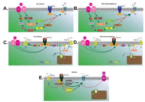 Schematic diagrams illustrating how PAC1 and NOP receptor signaling in POMC neurons is altered under various energy balance states. (A), In POMC neurons from ad libitum-fed animals, N/OFQ activates the NOP receptor that initiates Gi/o-mediated signaling and subsequent activation of GIRK channels through positive allosteric modification by the βγ complex. This in turn promotes K+ efflux and inhibition of POMC neurons, effects which are dampened by E2 acting through ERα and Gq-mER to stimulate PI3K and nNOS as well as PLC, PKC and PKA signaling pathways, respectively. (B), In POMC neurons from obese animals, NOP receptor/effector coupling is enhanced; leading to a greater inhibitory effect of N/OFQ on POMC neurons. This N/OFQ-induced inhibition of POMC neurons is once again abrogated by E2 in POMC neurons from obese females. (C), Under ad libitum conditions, PACAP activates its cognate PAC1 receptor to elicit Gq-mediated signaling; working through PI3K as well as PLC, IP3, DAG and PKC to promote Ca2+ mobilization from intracellular stores and the coupling of PAC1 receptors to TRCP5 channels. This leads to cation flux through the channel pore that depolarizes and thereby excites POMC neurons. In females, E2 can act via ERα and Gq-mER to potentiate PAC1 receptor/TRPC5 channel coupling and PACAP-induced excitation of POMC neurons. (D), Under conditions of diet-induced obesity, the PAC1 receptor-mediated activation of TRPC5 channels in male POMC neurons is attenuated. However, in obese females the PACAP-induced excitation of POMC neurons is maintained due to the potentiating effect of E2. (E), Under conditions of fasting, the expression and activity of AMPK and protein tyrosine phosphatases like PTP1B is elevated in POMC neurons. This triggers a switch in the coupling of PAC1 receptors, such that they now are no longer linked with TRPC5 channels and instead inhibit rather than excite POMC neurons via activation of KATP channels. This inhibitory effect of PACAP in POMC neurons from fasted animals is diminished by E2 in females.