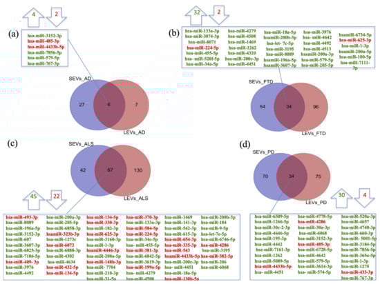 We previously demonstrated significant differences between LEVs and SEVs derived from plasma for dimension, markers, protein loading (see Figure S1a–d) [28,29,30]. Cellular miRNAs can selectively traffic into LEVs and SEVs, so we first identified differentially expressed miRNAs (DE miRNAs) in SEVs and LEVs among the four groups of patients (AD, PD, ALS, FTD) and the healthy controls (CTRs) (Table 1, Table S1). We then moved to investigate the number of different and common deregulated miRNAs that sort into SEVs and LEVs in the same disease. In AD, of the 33 miRNAs found in SEVs and 13 in LEVs, 6 distribute to both (Figure 1a), 4 up-regulated and 2 down-regulated. In FTD, of the 88 miRNAs in SEVs and 130 in LEVs, 34 were in common, 32 up-regulated and 2 down-regulated (Figure 1b). Concerning miRNAs in ALS, of the 109 miRNAs in SEVs and 197 in LEVs, 67 were in common, (Figure 1c), 45 up-regulated and 22 down-regulated. In PD, of the 104 miRNAs found in SEVs and 109 in LEVs, 34 distribute to both (Figure 1d), 30 up-regulated and 4 down-regulated. The percentage of common miRNAs between SEVs and LEVs are shown in Table 2.