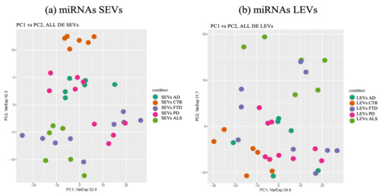 miRNAs detected as differentially expressed in SEVs were pooled together and analyzed by principal component analysis (PCA) (Figure 2a). The same approach was applied to LEVs.