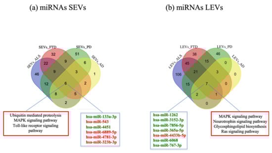 Venn diagram showing numbers of common and unique miRNA and RNA in SEVs (a) and LEVs (b) from plasma of AD, FTD, ALS and PD patients. Common miRNAs and pathways are listed. Differential miRNA expression analysis by edgeR (log2FC > 1, p-value < 0.05). AD = Alzheimer Disease; FTD = Fronto-Temporal Dementia; ALS = Amyotrophic Lateral Sclerosis; PD = Parkinson Disease; CTRs = controls; SEVs = small extracellular vesicles; LEVs = large extracellular vesicles; miRNA = microRNA.