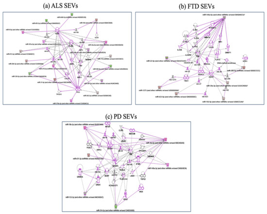 IPA networks among deregulated miRNAs in SEVs from ALS (a), FTD (b), PD (c). For ALS miRNAs involvement in regulation of DDX58/IFIH1, through miR31-5p and miR615-5p (a); for FTD IL1F10 and TLR10 regulation by miR146a-5p (b); for PD, regulation of GRIA1, Glutamate receptors, by miR-132-3p, involvement of JAG1 and TNF regulated by miR-34 (c). Pink color indicates activation while green color indicate suppression. No pathway could be calculated for AD disease for the few miRNAs targets. FTD = Fronto-Temporal Dementia; ALS = Amyotrophic Lateral Sclerosis; PD = Parkinson Disease; CTRs = controls; SEVs = small extracellular vesicles.