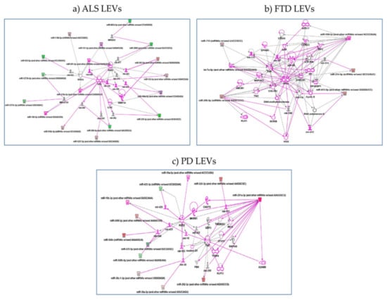 Gene ontology analysis found also pathways involved: (1) in regulation of G0 to G1 transition in LEVs from ALS patients; (2) in regulation of type I interferon-mediated signaling pathway and positive regulation of gene and posttranscriptional silencing in LEVs from FTD patients; (3) protein insertion into membrane, fibroblast apoptotic process, regulation of steroid biosynthetic process in LEVs from PD patients. Pathways are reported below in order of most significant p values and further details are shown in Table S2. IPA analysis confirmed the pathway found by both Reactome and Gene Ontology. (1) for LEVs from ALS regulation of p53 by mir-379, 378, 584-5p, 1207 emerged. hsa-miR-199a-5p and hsa-miR-329a-5p regulate LCN2, lipocalin2, inducible factor secreted by reactive astrocytes in transgenic rats with neuronal expression of mutant human TDP-43 or RNA-binding protein FUS and that is selectively toxic to neurons [34] (Figure 5a); (2) for LEVs from FTD patients regulation of genes like TP53 by miR-296 and RNA Polymerase II by miR-615 as well as Cyclin E regulated miR-615-5p, that might be part of gene expression and regulation of apoptosis [35] (Figure 5b); (3) for LEVs from PD patients regulation of ADAM9 (ADAM Metallopeptidase Domain 9), important in mediating cell–cell and cell–matrix interactions, by up-regulation of miR-291, miRNA that regulates cell proliferation and resolvin, a metabolic byproduct of omega-3 fatty acids, regulated by miR-302 [36,37] (Figure 5c).