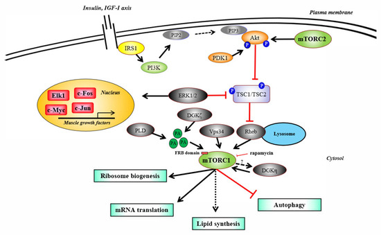 mTORC1 activity is regulated by the phosphoinositide 3-kinase (PI3K)/Akt (or “protein kinase B”, PKB) axis in response to nutrients and growth factors [98,99,100] (Figure 1). Insulin-like growth factor 1 (IGF-1) receptor is phosphorylated under mitogenic stimuli and recruits the insulin receptor substrate 1 (IRS1), leading to the activation of the phosphoinositide 3-kinase (PI3K). PI3K phosphorylates phosphatidylinositol diphosphate (PIP2) and, thus, generates phosphatidylinositol triphosphate (PIP3), which in turn activates several effectors, including the kinase phosphoinositide-dependent kinase-1 (PDK1). PDK1 phosphorylates and activates Akt, which promotes the inactivation of tuberous sclerosis complex 1/2 (TSC1/2) and the subsequent activation of mTOR through the Ras homolog enriched in brain (RHEB) GTPase [101,102,103,104,105,106,107,108,109,110,111]. Of note, mTORC2 phosphorylates Akt on Ser-473 facilitating Thr-308 phosphorylation by PDK1 [112]. However, muscles expressing a dominant-negative IGF-I receptor show hypertrophy associated with S6K1 phosphorylation in response to mechanical load, suggesting that IGF-1 receptor is not essential for muscle growth [113]. Recently, it was also found that IGF-1/Akt1 regulation is dispensable for activation of mTORC1 signaling and satellite cells following mechanical overload [114]. Furthermore, it was found that mechanical overload induces mTORC1 activation at the early phase thanks to the mitogen-activated protein kinase (MEK)/extracellular signal-regulated kinase (MEK/ERK) pathway through phosphorylation of TSC2 instead of the PI3K/Akt signaling [115]. ERK1/2 pathway is also involved in muscle growth through the regulation of nuclear transcriptional factors (i.e., Elk-1, c-Myc, c-Jun and c-Fos) [116].