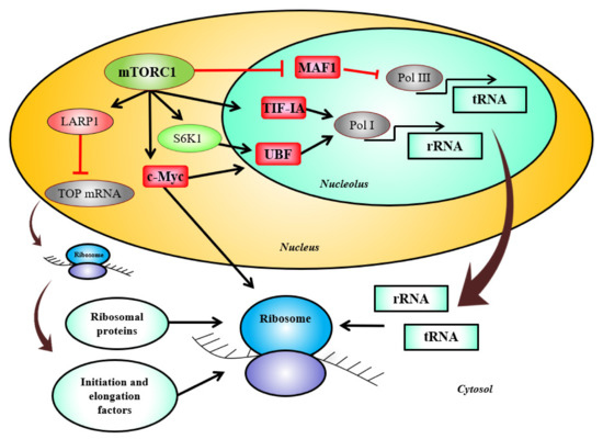 mTORC1 stimulates ribosome biogenesis. mTOR (mechanistic/mammalian target of rapamycin) modulates the activity of TIF-1A(transcription initiation factor IA) involved in pre-ribosomal RNA synthesis and of the ubiquitous transcription factor c-Myc that controls genes products involved in the transcription and processing of rRNA, in the protein components synthesis, and in the nuclear export of ribosomal subunits. mTOR phosphorylates MAF1 leading to inhibition of RNA Pol III (RNA polymerase III) repression function, allowing transfer RNA (tRNA) synthesis. mTORC1 (mechanistic/mammalian target of rapamycin complex 1) interacts with the RNA binding protein LARP1 (La-related protein 1), involved in TOP (terminal oligopyrimidine) mRNAs translation, and subsequently regulates the production of ribosomal proteins and initiation and elongation factors. S6K1 (S6 kinase 1), a master substrate of mTORC1, stimulates RNA Pol I (RNA polymerase I) through activation of UBF (upstream binding factor).