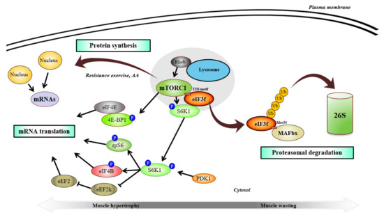 The regulation of skeletal muscle protein synthesis is a key event for skeletal muscle growth and hypertrophy, especially in response to exercise training (Figure 5). The development of strategies to struggle against atrophy is fundamental to improve the quality of life or the capacity of sick people to recover from illness. Thus, it is imperative to better understand the cellular and molecular mechanisms involved in skeletal muscle failure, as well as the impact of chronic exercise and additional nutritional strategies on muscle dysfunctions. mTORC1 controls embryonic and adult myogenesis without being essential for adult skeletal muscle mass maintenance under normal conditions. However, mTORC1 is essential for muscle growth and hypertrophy under mechanical stimulation, especially by controlling mRNA translation and ribosome biogenesis at multiple levels. After resistance exercise, translocation of mTOR to the lysosome surface and to the cell membrane leads to mTOR association with its regulators, RHEB and eIF3f, and appears consistent with a raised mRNA translation. Importantly, physical exercise is a powerful modulator of the aforementioned pathway, which needs to be more investigated in order to identify the best approaches to counteract atrophy in the long-term. The impact of resistance training has garnered increasing attention, notably in the context of aging. Resistance training appears beneficial in the elderly, especially when training with high-volume and low intensity is privileged. Of note, investigations on ribosomal turnover, including ribophagy (i.e., the degradation of ribosomes through autophagy) are still limited and need further attention.