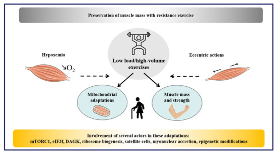 Finally, eccentric actions and hypoxic stress have emerged as promising strategies over the last few years. Eccentric actions may promote more robust mTORC1 pathway activation and increases of skeletal muscle mass and strength compared to concentric and isometric contractions [281,282,283]. Of note, normalization of the force-signal integral to a same magnitude effect leads to similar acute molecular anabolic responses [284,285,286,287]. A recent study showed that combined maximal concentric and eccentric training does not produce greater gains in muscular isometric strength and hypertrophy than maximal concentric training alone in young males [288]. Low-intensity eccentric actions should be used in frail people, such as aged subjects, to minimize the occurrence of muscle damage and the risk of a traumatic injury. Furthermore, combination of resistance exercise with hypoxic stress promotes several advantages. Indeed, in the last decade, investigations have been conducted on supplementation of hypoxia during resistance training. Reduction of intramuscular oxygen partial pressure promotes greater cellular stress in skeletal muscle and may improve several aspects of performance, including aerobic capacity and sprint ability in athletes [289,290,291].