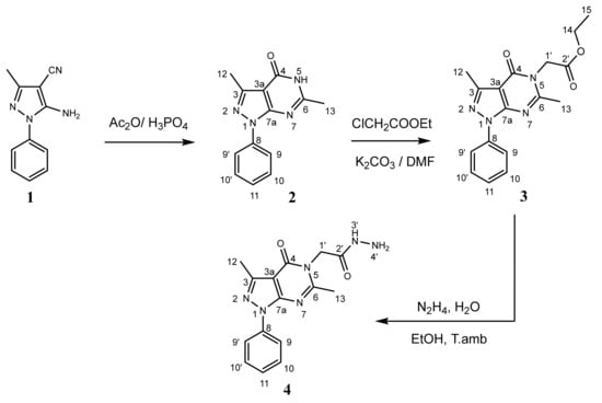 4.2.3. General Procedure for the Synthesis of 2-(3,6-dimethyl-4-oxo-1-phenyl-1,4-dihydro-5H-pyrazolo[3,4-d]pyrimidin-5-yl)acetohydrazide 4