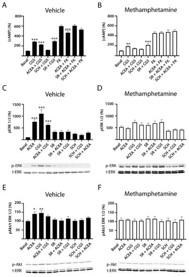 Methamphetamine effect on A2A–CB1Het functionality: cAMP and ERK/Akt phosphorylation. HEK-293T cells co-transfected with cDNAs for A2AR (0.5 µg) and for CB1R (0.6 µg) were treated (30 min) with vehicle (A,C,E) or 1 µM methamphetamine (B,D,F) and subsequently treated with 500 nM of the A2AR antagonist SCH 58261 (SCH) or with 500 nM of the CB1R antagonist SR 141716A (SR). Receptors were activated using 100 nM of the A2AR agonist CGS 21680 (CGS), with 200 nM of the CB1R agonist, ACEA or both, before adding 0.5 µM forskolin (FK) or vehicle. The cytosolic cAMP levels (A,B) and the extracellular signal-regulated (ERK) 1/2 (C,D) or Akt (E,F) phosphorylation signals were determined. Results are expressed as percentage over basal and are the mean ± SEM of six experiments performed in triplicates. A one-way ANOVA followed by Bonferroni multiple comparison post hoc test showed a significant effect (* p < 0.05, ** p < 0.01, *** p < 0.001 vs. basal condition; ### p < 0.001 vs. FK condition). In (C–F) a representative Western blot is shown (bottom). p-ERK indicates phosphorylated ERKs, t-ERK indicates total ERKs, p-AKT indicates phosphorylated AKTs.
