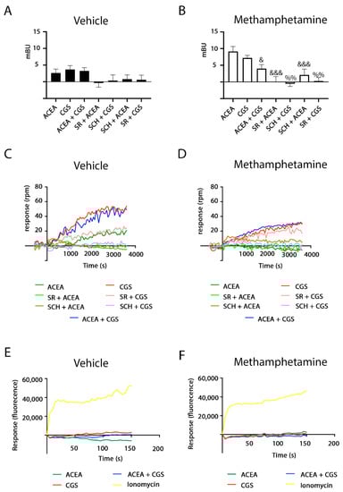 Methamphetamine effect on A2A–CB1Het functionality: ß-arrestin-2 recruitment, dynamic mass redistribution (DMR) and Ca2+ mobilization. HEK-293T cells transfected with cDNAs corresponding to A2AR-YFP (0.4 µg), CB1R (0.3 µg) and ß-arrestin-2-Rluc (0.5 µg) (A,B) or with A2AR (0.5 µg), CB1R (0.6 µg) (C,D) and 6GCaMP calcium sensor (1.5 µg) (E,F) were treated (30 min) with vehicle (A,C,E) or with 1 µM methamphetamine (B,D,F) and subsequently treated with 500 nM of the A2AR antagonist SCH 58261 (SCH) or with 500 nM of the CB1R antagonist SR 141716A (SR). Receptors were activated using 100 nM of the A2AR agonist CGS 21680 (CGS), with 200 nM of the CB1R agonist ACEA or both. In (E,F), a portion of the cells were stimulated with 1 µM ionomycin as a positive control. The BRET data resulting from ß-arrestin-2 recruitment (A,B), time-dependent DMR representative traces (C,D) and time-dependent representative traces of cytoplasmic Ca2+ levels (E,F) are shown. In (A,B), BRET is expressed as milli BRET units (mBU) and is given as the mean ± SEM of six different experiments grouped by amount of BRET acceptor. A one-way ANOVA followed by Bonferroni multiple comparison post hoc test showed a significant effect over 100% (& p < 0.05, &&& p < 0.001 versus ACEA condition; %% p < 0.01 versus CGS condition).