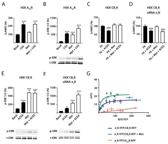 σ1R involvement in methamphetamine effects on A2A and CB1 receptors. HEK-293T cells transfected with cDNAs coding for A2AR (0.5 µg) (A,B) or for CB1R (0.6 µg) (C–F) in the absence (A–C,E) or presence (D,F) of siRNA for σ1R (3 μg) to silence σ1R were stimulated with 1 µM methamphetamine (Met, white bars) or vehicle (black bars) for 30 min. Cells were treated with 100 nM of the A2AR agonist CGS 21680 (CGS) (A,B) or with 200 nM of the CB1R agonist, ACEA (C–F). 0.5 μM of forskolin (FK) was used to determine Gi coupling to the CB1R. Then, cAMP levels (A,C,D) and ERK1/2 phosphorylation (B,E,F) were determined and expressed as percentage over basal or, in the case of cAMP in CB2R-expressing cells, over forskolin treatment. Values are the mean ± SEM (n = 5, in triplicates). One-way ANOVA followed by Bonferroni multiple comparison post hoc test showed a significant effect (* p < 0.05, *** p < 0.001 vs. basal condition, ### p < 0.001 versus FK condition). In (B,E,F), a representative Western blot is shown (bottom). In (G), FRET experiments were performed in HEK-293T cells transfected with 0.25 μg of cDNA for σ1R-YFP and increasing amounts of cDNA for CB1R-RFP (0.2 μg to 2 μg) or for A2AR-RFP (0.1 μg to 1.5 μg). When indicated cells were pretreated with 1 µM methamphetamine. Results were grouped by amount of FRET acceptor. p-ERK indicates phosphorylated ERKs, t-ERK indicates total ERKs.