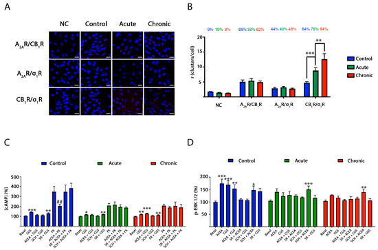 Methamphetamine effect on A2A–CB1Het expression and signaling in striatal neurons. (A,B) Proximity ligation assays (PLA) were performed in striatal neurons treated with 1 µM methamphetamine for two hours (acute, green bars), for one week (chronic, red bars) or with vehicle (control, blue bars) using primary antibodies specific for the A2A, σ1 and CB1 receptors. As a negative control (NC), neurons were only treated with the primary antibody against CB1R. See Methods for details on the steps in the PLA procedure. Confocal microscopy images (stacks of 4 consecutives planes) show heteroreceptor complexes as red clusters over Hoechst-stained nuclei (blue). Scale bar 20 µm (A). The bar graph (B) shows the number of red dots/neuron and the number above the bars indicates the percentage of neurons presenting red dots. Values are the mean ± SEM (n = 8–10). A two-way ANOVA followed by Bonferroni’s multiple comparison post hoc test were used for statistical analysis (** p < 0.01, *** p < 0.001). cAMP levels (C) and ERK 1/2 phosphorylation (D) were determined in striatal neurons treated with methamphetamine 1 µM for two hours (acute, green bars) or for one week (chronic, blue bars) or vehicle (control, blue bars). When indicated cells were incubated with 500 nM of the A2AR antagonist SCH 58261 (SCH) or with 500 nM of the CB1R antagonist SR 141716A (SR). Receptors activated using 100 nM of the A2AR agonist CGS 21680 (CGS) or with 200 nM of the CB1R agonist ACEA. Forskolin (FK) was used to determine Gi coupling to the CB1 receptor (C). The values are the mean ± SEM of six experiments performed in triplicates. A two-way ANOVA followed by Bonferroni’s multiple comparison post hoc test were used for statistical analysis (* p < 0.05, ** p < 0.01, *** p < 0.001 versus basal condition; ## p < 0.01 versus FK condition).