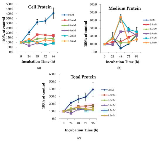 Intracellular protein (cell protein) peaked at 96 h with 0 mM concentration of L-Trp (Figure 1a). In terms of extracellular protein (medium protein), when L-Trp was added, most concentrations peaked at 48 h (Figure 1b). Thus, 48 h was the optimal incubation time for the secretion of medium protein by bovine mammary epithelial (MAC-T) cells. The result of the incubation time test suggested that 48 h should be adopted as the incubation time for further tests of L-Trp efficacy for protein synthesis. Tables S1–S3 shows the average relative percentages of cell, medium and total protein, respectively.