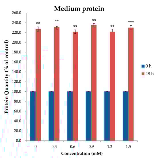 A confirmatory study was performed to determine the ideal dose of L-Trp at 48 h, which was considered as the optimal cultivation time (Figure 2). Although the value was not significantly different, 0.9 mM showed the numerically highest relative protein quantity. The relative percentage of medium protein level on MAC-T cells supplemented with different levels of L-Trp at 48 h incubation is shown on Table S7. Statistical analysis of heterogeneity (Q) of medium protein (Table S8) of MAC-T cells supplemented with different dosages (0, 0.3, 0.6, 0.9, 1.2, 1.5 mM) of L-Tryptophan at 48 h incubation time shows that replication samples are homogeneous except for 0.3 mM homogeneous (p < 0.05).