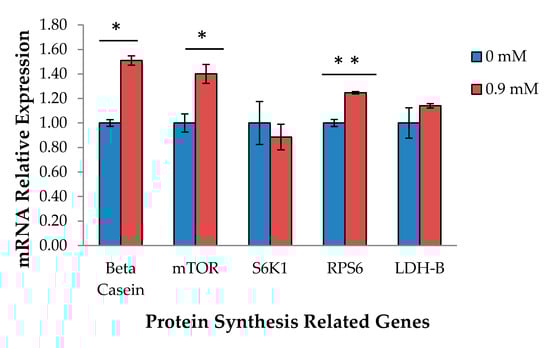 In terms of mRNA relative gene expression, β-casein mRNA expression and genes related to milk protein synthesis, such as mTOR and RPS6, were also stimulated upon addition of 0.9 mM L-Trp (p < 0.05) (Figure 3). On the other hand, there was no effect on S6K1 and LDH-B gene expression upon addition of L-Trp (p > 0.05).