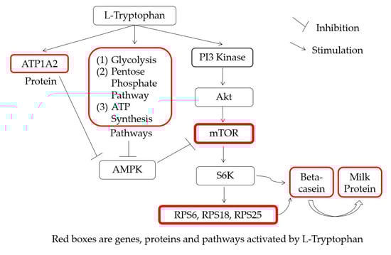 Protein and energy metabolism-related pathway results showed that glycolysis, the pentose phosphate pathway, and ATP synthesis were stimulated upon supplementation with L-Trp. These energy-related pathways are stimulated in parallel with the increased protein synthesis rates due to the fact that milk protein synthesis is an energy-consuming process [,]. The interaction between energy and protein supplementation in the phosphorylation of mTOR in dairy cows infused for 36 h with starch and energy has been reported []. In that study, they investigated signaling pathways responsive to casein and starch infusion in primiparous mid-lactation Holstein cows. The results showed that cell signaling molecules involved in the regulation of milk protein synthesis responded differently to the various nutritional stimuli, and the phosphorylation of mTOR was increased in response to starch when casein was infused.