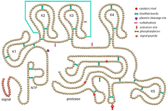 Plasmin is a major fibrinolytic protease generated by converting its zymogen plasminogen by fibrinolytic activators in the presence or absence of fibrin. Plasminogen is synthesized primarily in the liver and circulates in plasma at a concentration of approximately 1.5 μmol/L [1]. Glu-plasminogen is a single chain glycoprotein with glutamic acid (Glu) as the NH2 residue, consisting of an N-terminal activation peptide (NTP), five kringle domains (K1–K5), and a serine protease domain containing the catalytic triad (Figure 1) [1,2].