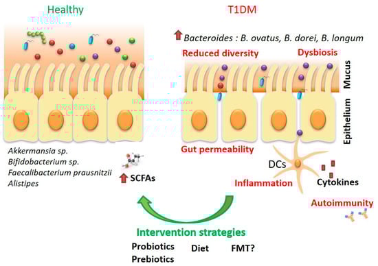 - Abdellatif, A.M.; Sarvetnick, N.E. Current understanding of the role of gut dysbiosis in type 1 diabetes. J. Diabetes 2019, 11, 632–644. [Google Scholar] [CrossRef] [PubMed]