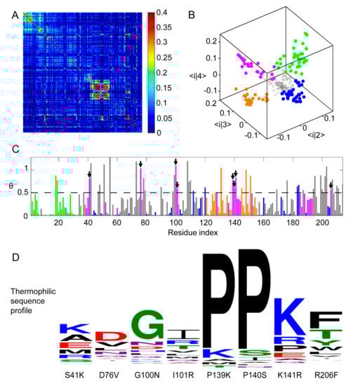 Residue Correlation Analysis (RCA) of Protein Sectors in ADK Family. (A) Heat map representation of RCA matrix rij for MSA of ADK. X− and y−axis coordinates both correspond to residue indices of ADK from E. coli, which has 214 residues. (B) Three dimensional scatter plot of the 214 residues in the space formed by the three eigenvectors of the second, the third, and the fourth largest eigenvectors. Each data point represented one position. After eliminating randomized background residues (gray), the rest of the positions could be clustered into four sectors, colored green, blue, orange, and magenta. (C) The relative entropy angle θ of thermophilic and mesophilic sequence profile at each position. Bars were colored by sectors. Residues whose angles were larger than 0.5 in the magenta sector were selected for further mutation (marked by arrow heads). (D) Amino acid distribution of thermophilic sequences at the chosen mutation positions. The first series of single-point mutations were S41K, D76V, G100N, I101R, P139K, P140S, K141R, and R206F.