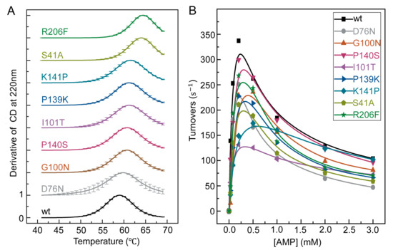 In the enzymatic forward activity assay at room temperature (Figure 2B), these thermostable mutants had turnover rates at [ATP] = [AMP] = 1 mM that were 56–98% of that of the wild type among which the most stable variant, R206F, retained 75% of the activity (Table S1). For the mutants with the lowest turnover rates, I101T and K141P, they seemed to have lost their magnesium activation effect [19] instead of losing the overall enzymatic activities. Since the optimal reaction temperatures of mutants are shifted as shown in later, the room temperature reaction rate of the mutants are not fully reflective of their activities. Nonetheless, the preservation of room temperature activity shown in Figure 2B is still an important metric to confirm the success of enzyme design, as our goal is to improve the thermal stability of the enzyme without significantly jeopardizing its activity at its original working temperature.
