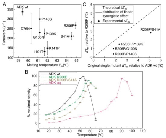 So far, our work revealed that appropriate single-point mutations could generate thermostable ADK mutants. However, multiple residue substitutions might be able to further improve the thermostability. For example, Euiyoung Bae redesigned the ADK from Bacillus subtilis by mutating as many as 26 residues and finally obtained a thermally stable variant with a ΔTm of 12.5 °C [9]. Moreover, different thermostability-improved mutants, which were derived from various stabilization methods, such as directed evolution, comparative study, or theoretical computation, could be combined together to form one construct with a higher Tm [21]. Taking all above cases into account, we went beyond single residue substitution and constructed a set of double mutants using the eight single-mutated variants. This was to examine, through our method, whether mutants with more point substitutions could achieve a greater thermal stability gain and show additive effects in Tm. As expected, four double mutants (R206F/S41A, R206F/G100N, R206F/P139K, and R206F/P140S) showed improved thermal stabilities compared with their original single-point mutants, which confirmed the synergistic effect of two stabilizing single mutations. In addition, all double mutants displayed a Tm increment lower than the summation of the respective ΔTm s from the two original individual mutants. Furthermore, our results demonstrated that the additive effect weakened as the sum of two ΔTm increased (Figure 3C), which is consistent with the literature [21].