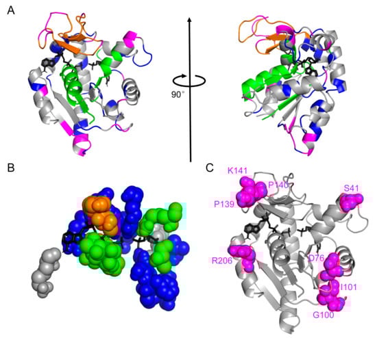 Mutations sites chosen by the relative entropy angle θ. (A) Residues colored according to our protein sectors color scheme on the “closed” conformation of ADK (PDB id: 1ANK chain A). ATP analog and AMP (both colored black) were shown in sticks. The structure on the right was obtained by rotating the diagram on the left by 90 degrees clockwise around the vertical axis. (B) Residues directly participating in substrate binding in E. coli ADK. All sectors except the magenta one were involved in ADK’s function execution. (C) Eight selected mutation sites were marked as magenta spheres in the tertiary structure of ADK.