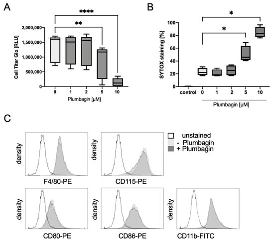 Plumbagin does not change the phenotype of bone marrow-derived macrophages: (A) the influence of increasing concentrations of plumbagin in the presence of 25 ng/mL M-CSF was tested after 48 h by measuring cell viability (n = 3, with triplicates); (B) cell death triggered by increasing plumbagin concentrations was measured after the incubation of the cells with SYTOX after 48 h of treatment in the presence of M-CSF (n = 4); statistical analysis was performed comparing the results to the positive control (M-CSF) in (A) using Friedman, and in (B) using Mann–Whitney test; (C) the effect of 2 µM plumbagin was tested on the expression of the macrophage marker molecules F4/80, CD11b, CD80, CD86 and CD115, respectively. The graphs represent one typical example (n = 3). *: p ≤ 0.05; **: p ≤ 0.01; ****: p ≤ 0.0001.
