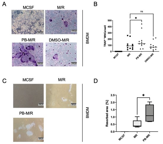 Plumbagin pre-treatment of bone marrow-derived macrophages (BMDMs) facilitates osteoclastogenesis: (A,B) BMDMs were seeded in a 96-well plate and treated with M-CSF or 2 µM plumbagin on day 0. After 24 h, M-CSF/RANKL was added to the wells of M/R and PB-M/R samples. On day 3, the cells were stimulated with M-CSF, M-CSF/RANKL or plumbagin/M-CSF/RANKL, respectively, until the osteoclasts were fully differentiated; (A) shows representative pictures (magnification 100×) and (B) presents the quantification of TRAP stains (n = 6, five of them with duplicates); (C,D) BMDMs were stimulated as described in (A) on 24-well osteo assay surface plates before quantifying the resorbed area on day 10 (n = 3, with duplicates); statistical analysis was carried out comparing the results to the positive control (M-CSF/RANKL) using Friedman test in (B) using a Friedman test and a Mann–Whitney test in (D). *: p ≤ 0.05; ns: p > 0.05.
