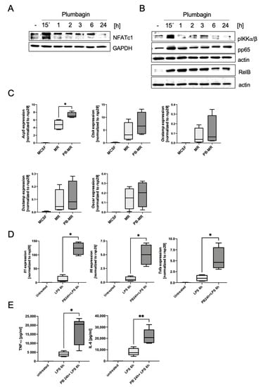 Plumbagin induces the rapid activation of cellular signalling in BMDMs: (A,B) Western blot analysis to test typical osteoclast signalling molecules was performed using antibodies against NFATc1 (A) and molecules of the NF-κB pathway (B). GAPDH and actin were used as loading controls. The blots are typical examples out of three independent experiments; (C) differentiating osteoclasts were analysed on day 3 by RT-PCR to determine the expression of the osteoclastic marker genes Acp5, Ctsk, Ocstamp, Dcstamp and Oscar, respectively (n = 4). Statistical analysis comparing the results to the positive control (M-CSF/RANKL) was performed using Mann–Whitney test; (D,E) BMDM were either pre-stimulated with plumbagin for 24 h before stimulation with 100 ng/mL LPS for 6 h or stimulated directly with LPS. (D) RT-PCR was performed to determine the expression of the osteoclastogenic, pro-inflammatory cytokine genes Il6, Il1 and Tnfa, respectively (n = 4); (E) the supernatants of the samples were subjected to ELISA to determine the levels of produced cytokines (n = 5). Statistical analysis comparing the results to the positive control (LPS) was carried out using a Mann–Whitney test in (D) and (E). *: p ≤ 0.05; **: p ≤ 0.01.
