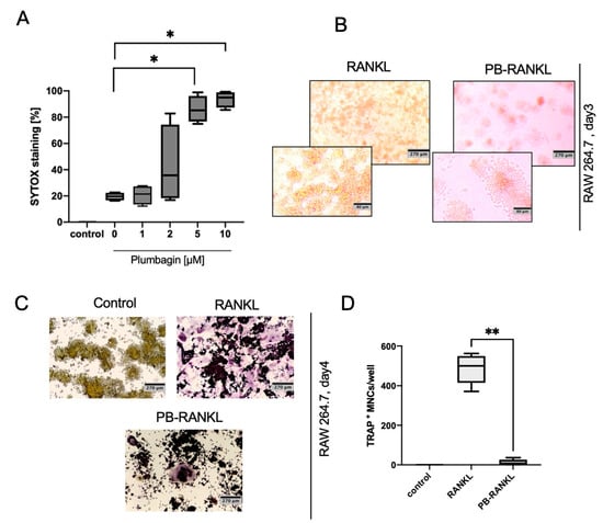 Plumbagin inhibits osteoclastogenesis in RAW264.7 macrophages. (A) RAW264.7 cells were treated with increasing concentrations of plumbagin for 24 h and cell viability was measured after incubation with SYTOX. Statistical analysis was performed comparing the results to the control in using a Mann–Whitney test (n = 4); (B,C) and (D) RAW264.7 cells were seeded in a 24 well plate and treated with RANKL or plumbagin (1 µM) /RANKL. On day 3, cells were restimulated with RANKL, plumbagin/RANKL, respectively, until the osteoclasts were fully differentiated; (B) shows representative pictures and (C) the quantification of TRAP stains (n = 3, with duplicates); (D) one day before the TRAP staining was performed, light microscopic pictures (magnification 100×) were taken to document cell viability and cell numbers. *: p ≤ 0.05; **: p ≤ 0.01.