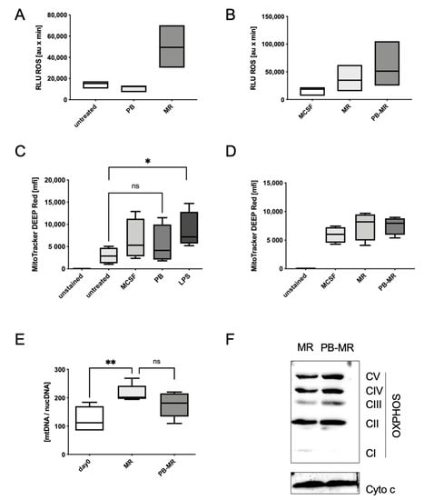 Therefore, we then addressed whether an upregulation of ROS formation could be the reason for the observed increase in osteoclastogenesis. While there was no ROS production after plumbagin alone (Figure 5A), a slight increase in ROS levels for cells pre-treated with plumbagin before M-CSF/RANKL stimulation could be detected using a luminol assay (Figure 5B). This suggests that plumbagin is able to exacerbate RANKL-mediated ROS production. Therefore, we then investigated if we could detect an impact of plumbagin on mitochondrial activity, the number of mitochondria or the expression of OxPhos components, respectively, since all of these factors are known to contribute to osteoclast formation and activity []. In contrast to the ROS assay in Figure 5B, which measured the total ROS levels from mitochondrial and cytoplasmic ROS sources, a Mitotracker deep red stain for activated ROS-producing mitochondria did not detect an increase in mitochondrial activity after 6 h of incubation with plumbagin compared to M-CSF-treated cells (Figure 5C).