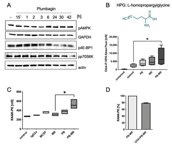 While we did not observe major changes in pAMPK levels at early timepoints (Figure 6A), there seemed to be in increase over time (>6 h). Much to the contrary, 4EB-P1 phosphorylation increased early (15 min) and decreased after 6 h of stimulation. A similar pattern was observed for p70S6K, although the initial increase was observed after 1 h of plumbagin treatment. Again, a significant drop in protein phosphorylation that coincided with the upregulation of pAMPK could be observed at time-points later than 24 h. Since p4E-BP1 and p70S6K both play a role in the initiation of protein translation, we next checked if we could detect translational activity in the cells. To this end, we performed a fluorescence-based pulse-chase experiment and the cells were grown in methionine-free medium before L-homopropargylglycine (HPG), a reactive methionine analogue, was added for 30 min. The addition of CuSO4 and Alexa488 after 6 h started a click reaction and coupled the dye to incorporated HPG residues. FITC fluorescence was then measured and analysed using a flow cytometer. The data shown in Figure 6B clearly reveal an increase in translational activity in the presence of plumbagin alone with no other stimuli, even though the effect of M-CSF/RANKL treatment is more pronounced. This can probably be explained by the fact that plumbagin treatment was performed in the absence of any other survival factors such as M-CSF. As a control, the cells were stimulated with plumbagin and the translation inhibitor cycloheximide (Figure S4). However, pre-treatment with plumbagin was able to synergistically increase the translational activity of the cells and resulted in a significant upregulation (approximately 45%) compared to M-CSF/RANKL alone.