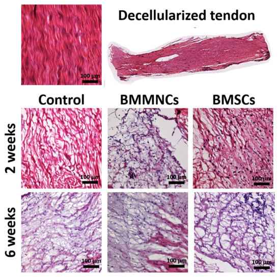 Representative pictures of decellularized tendon graft in the control, BMMNC, and BMSC groups at 2 weeks and 6 weeks after operation. BMMNCs: Bone Marrow Mononuclear Cells; BMSCs: Bone Marrow Stromal Cells. Bar = 100 µm.