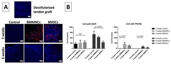 (A) The histological pictures of DAPI/PKH26 staining in decellularized tendon graft, control, BMMNC, and BMSC groups. (B) The total cell number (DAPI; blue) and seeded cells (PKH26; red) in the control, BMMNC, and BMSC groups 2 and 6 weeks after operation. n = 3 per group. Blue: DAPI (cell nucleus); Red: PKH26 (seeded cells). White bar = 100 µm. N.S. indicate no statistically significant difference between groups.