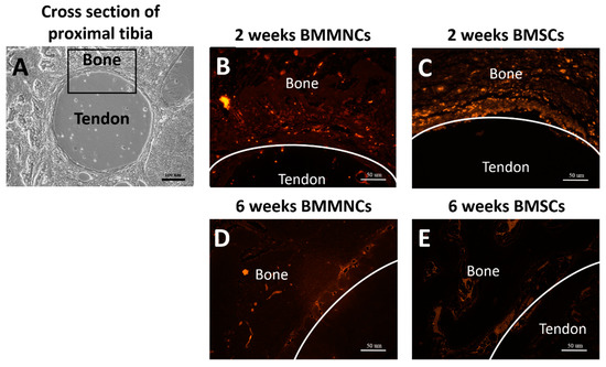 The intra-articular-injected BM cells (stained with PKH26 in red; BMMNCs (Figure 3B) and BMSCs (Figure 3C)) infiltrated into the interface between the tendon-bone tunnel after two weeks post operation. At six weeks post operation, few injected BM cells were found in the tendon-bone interface (Figure 3D,E).