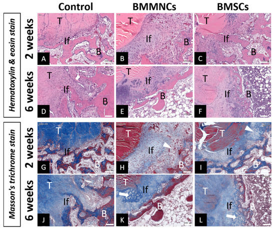 Haematoxylin and eosin (H&E) and Masson trichrome staining of tendon-bone interface in the control, BMMNC, and BMSC groups. The control group showed smaller interface gaps at both two (A,G) and six weeks (D,J), and more maturated and reorganized collagen fibers penetrating the tendon at six weeks without obvious junction (D,J). The BM-injected groups presented broader interface with fibrocartilage healing at two weeks (B,C,H,I) and six weeks (E,F,K,L). White arrow head at two weeks (H,I) and white arrow at six weeks (K,L) indicate the fibrocartilage formation area. T: Allograft tendon; B: Bone; If: Interface; Bar = 100 µm.