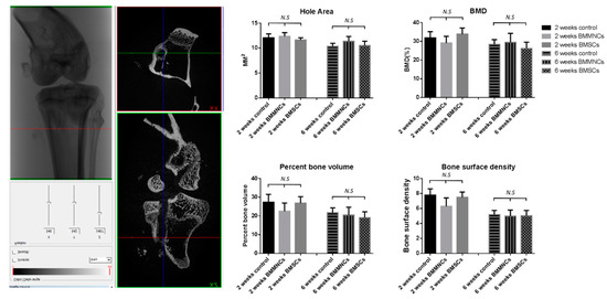 Micro-CT analysis of proximal tibia specimens. The figures show the result of bone tunnel hole area, BMD, percent bone volume, and bone surface density among the control, BMMNC, and BMSC groups at two and six weeks after operation. n = 4 in control group, n = 5 in BM cells-injected groups at both two and six weeks. N.S. indicate no statistically significant difference between groups.