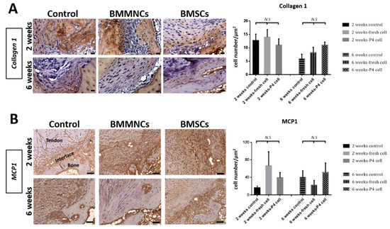 Representative immunohistochemistry images revealed collagen I (A) and MCP1 (B) expression in control, BMMNC, and BMSC groups at two and six weeks. Bar = 50 µm. n = 3 in each group at both two and six weeks. N.S. indicate no statistically significant difference between groups.
