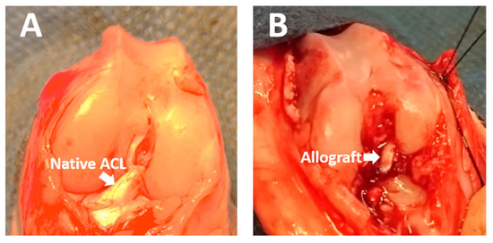 (A) The rabbit knee joint was exposed and the anterior cruciate ligament (ACL) was identified. (B) The allograft was passed through the tibial and femoral bone tunnel.