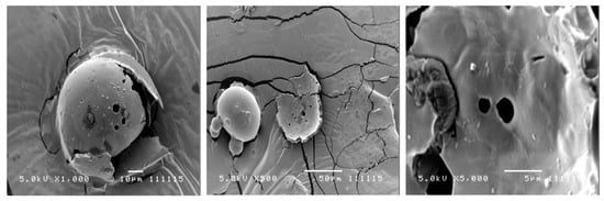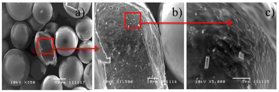 The SEM cross-sectional images of alginate NP-loaded PLGA microparticle (MP) and alginate NP coated chitosan-loaded PLGA MP are shown in Figure 1 and Figure 2. To expose the interior structure, showing the nanoparticles encapsulated, there is a need to cut the particles using a scalpel. The typical size of the microcapsules achieved was approximately 100 µm. This can also help in the confirmation of the hollowness of the microcapsules. The images exhibited a hollow core filled with NPs. Regardless of the materials of NPs, all the NPs were localized near the capsule shell. This is further supported by the studies done, where the drug-loaded particles were successfully encapsulated in a hollow microcapsule [].