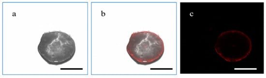 Confocal laser scanning microscopy (CLSM) images of alginate NPs-encapsulated microcapsule. (a) Brightfield, (b) Overlaid representation of all the components, and (c) Emission of the Rhodamine B(red) encapsulated in alginate NPs. Scale bar = 50 μm.