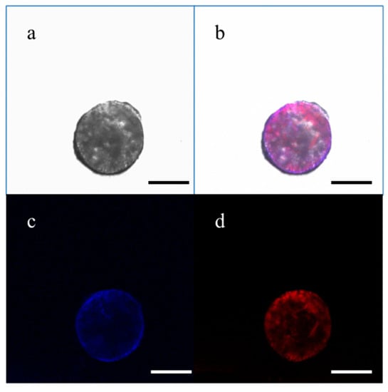 Confocal Laser Scanning Microscopy (CLSM) was used to show the qualitative graphics on the distribution of the encapsulated particles. CLSM is very useful for determining the relative positions of particles or capsules in three dimensions. Therefore, we tried to show the successful encapsulation of nanoparticles in PLGA microcapsules by two different studies including SEM and CLSM. Different dyes (i.e., rhodamine B and trypan blue) were replaced by Figure 3 and Figure 4 show the CLSM images of the PLGA microcapsule with the encapsulation of dye-loaded alginate NPs and alginate NPs coated with chitosan, respectively. It can be seen from Figure 3b and Figure 4b that the fluorescence of the dyes did not transcend out of the PLGA MCs wall when the optical images (Figure 3c and Figure 4c,d) were overlaid with their respective brightfield images (Figure 3a and Figure 4a). The brightfield images in Figure 4 and Figure 5 exhibit irregular spheroid shapes. Since the microcapsule has a hollow core where nanoparticles are encapsulated, the microcapsule possesses an imperfect spheroid shape. That is the reason why the brightfield image looks overexposed. What the authors have tried to explain from CLSM images, the Rhodamine B encapsulated in nanoparticles were well-dispersed in the hollow core of the microcapsules. Furthermore, in Figure 3b and Figure 4b, the microcapsules had shown simultaneous emission spectra, proving that there was a successful encapsulation of the dye-loaded nanoparticles within a microcapsule. Thus, this method proved that the encapsulation of nanoparticles within microcapsule was successful. It can also show that the distribution of the nanoparticles was along the inner wall of the shell of the PLGA microcapsule. With all the results obtained from the CLSM, it could be concluded that NPs were successfully entrapped in the PLGA MCs.