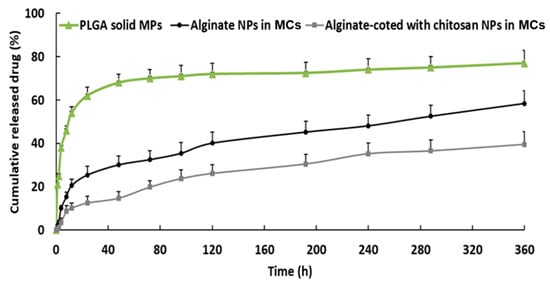 The cumulative release profile of MET from PLGA MPs, alginate NPs in MCs, and alginate coated with chitosan NPs in MCs (n = 3, mean ± SD).